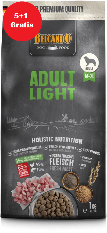 BELCANDO FINEST LIGHT hrana za pse predstavlja ukusan, zasitan i zdrav recept zahvaljujući odabranim sirovinama. Ograničen udeo belančevina i masti čine Finest Light posebno pogodnim za pse niskog stepena aktivnosti i starije pse. Posebno visok udeo sirovih vlakana omogućava psima da lakše održavaju ili smanjuju težinu ali u isto vrijeme stvara osećaj sitosti kod pasa. Smanjen udeo fosfora i natrijuma rasterećuje bubrege. Proizvedeno bez pšenice i ostalih žitarica koje sadrže gluten, soje, kukuruza i mlečnih proizvoda.